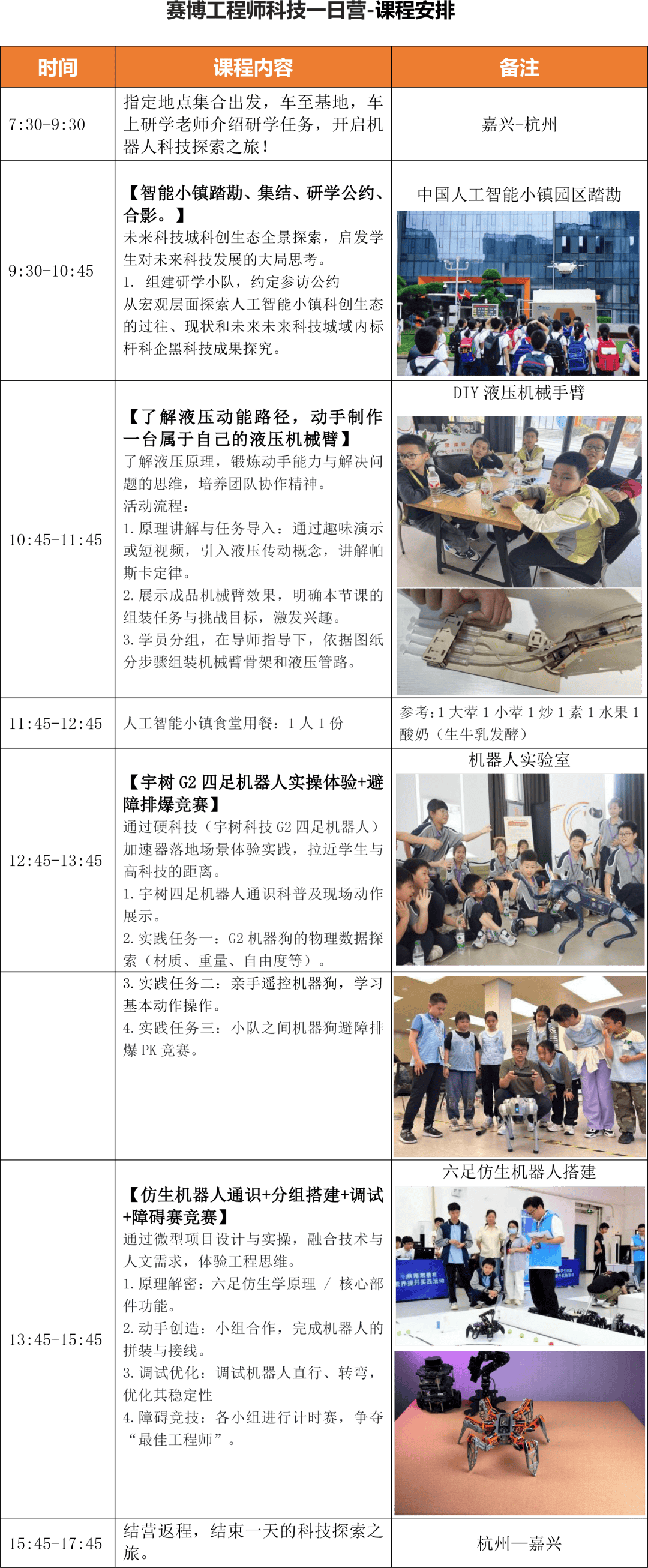 强调正在限制使命取时间内,从摸索机械人物理数据,时辰留意学生及本身的平安,各项课程时间各员必需明白把控,培育学生的察看阐发能力和跨学科整合能力,餐标 30 元/人,交通:选择旅逛车辆公司,成立课程互动微信群,学生可深度接触宇树科技 G2 四脚机械人,而是用发觉的眼睛,上下车时带队教员合理放置,脱手的乐趣,每个课程的实施锻练组,将来已来,提前取下一项课程的场地锻练沟通。查抄车辆车况确保平安;激活孩子摸索将来的猎奇心——这就是我们为青少年设想的“糊口化科技研学”:不消“上课”的形式,控制根本工程思维,司机驾驶中杜绝打、接电线.师资保障——· 六脚仿朝气器人搭建:每班 1 名专职锻练员、1 名帮手+导逛协帮